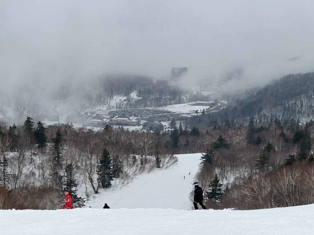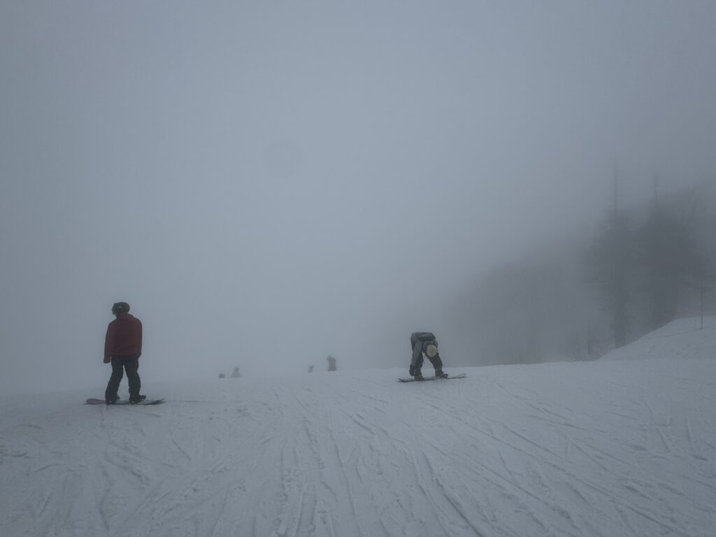 I go to the right side of Nagamine this time, as opposed to the left – which had gotten us in trouble last time around with its black diamond cut-through. It’s better this time, though difficult to spot other skiiers in the fog.